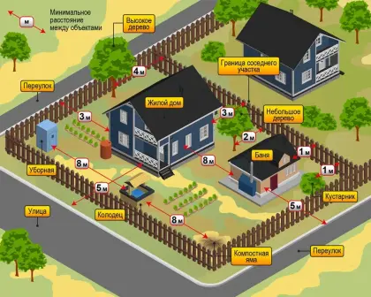 1. Определяем положение дома на участке: от границы земли с уличной стороны до дома должно быть расстояние...