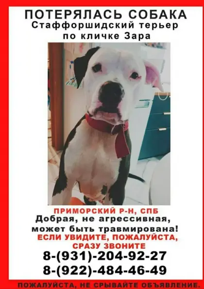 23 января вечером, возле Лидии Зверевой, дом 5 машина сбила собаку. Зовут Зара. Девочка добрая, не агрессивная. Испугалась и убежала в сторону комплекса «Шуваловский лёд».
