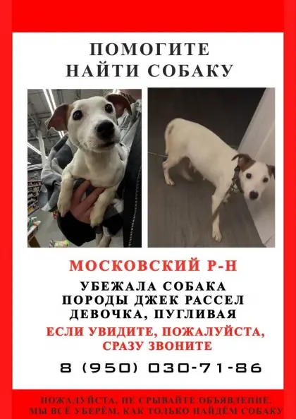 В Московском районе 28 декабря 2025 во время прогулки убежала собачка породы Джек Рассел, от дома 42к9 на Пулковском шоссе.