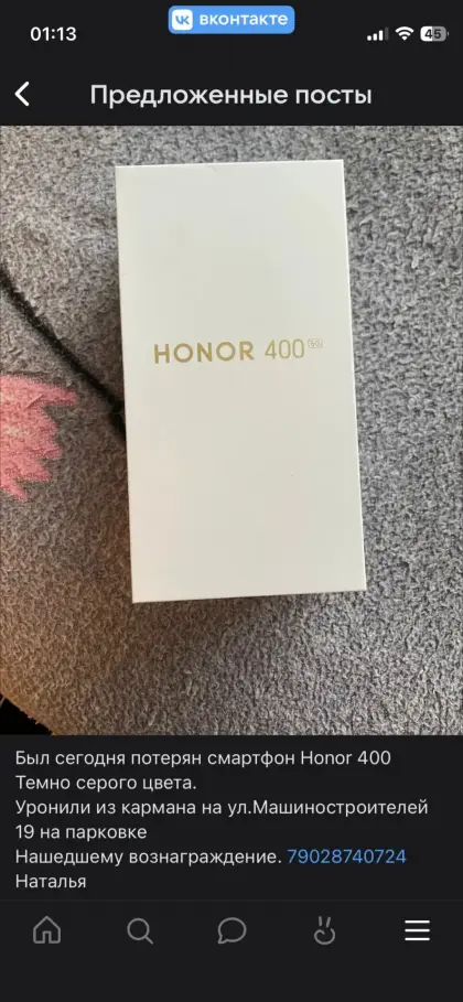Найден телефон около дома по адресу краснофлотцев 33, на противоположной стороне от остановки шефская, в районе 7:24 утра,в четверг 29 января.