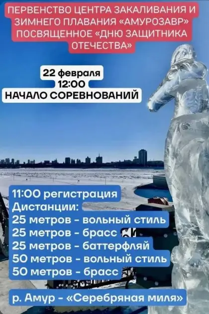 Днём, в 12:00 — первенство по зимнему плаванию. Мужчины и женщины от 18 лет и старше — будут выяснять, кто быстрее в ледяной воде. Дистанции — 25 и 50 метров. На пляже Пограничном.