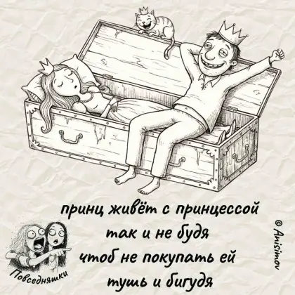- Так и быть, жена. Два желания моих, одно твоё! - говорит муж, предвкушая разоблачения супруги. Обращается он к рыбке: