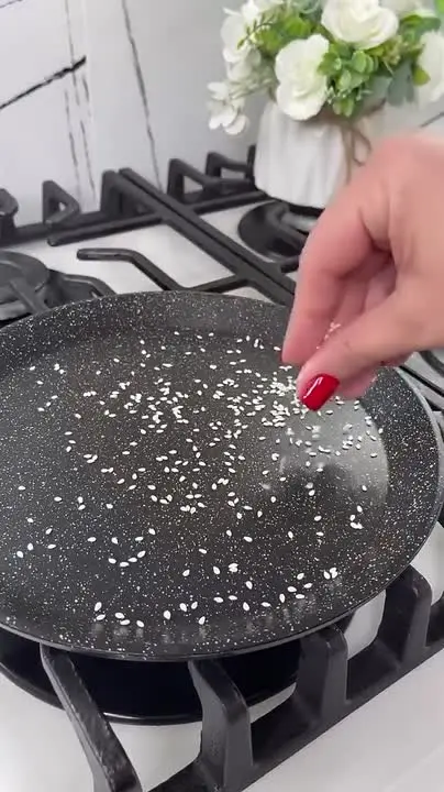 2️⃣ Сковороду разогреть, смазать маслом. Посыпать кунжутом, выложить натёртый сыр.