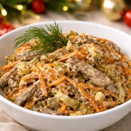 Этот салат относится к тем рецептам, которые сохраняют сразу — без раздумий. Он сытный, гармоничный по вкусу и выглядит достойно даже на праздничном столе. Сочетание мяса, грибов, маринованных огурцов и корейской моркови давно считается классическим, но именно в этом варианте оно раскрывается особенно удачно.