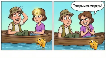 - Так и быть, жена. Два желания моих, одно твоё! - говорит муж, предвкушая разоблачение супруги, и обращается к рыбке: