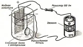 Для электрохимического окрашивания металлических деталей в любой цвет. Для электрохимического окрашивания деталей из стали, латуни или меди необходимо собрать гальваническую ванну и электрическую схему, как показано на рисунке.