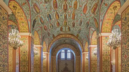 Гигантская потолочная фреска встречает посетителей прямо в центральном холле здания. На ней — генеалогическое древо Рюриковичей и Романовых. От княгини Ольги и князя Владимира до императора Александра III, всего 68 портретов.