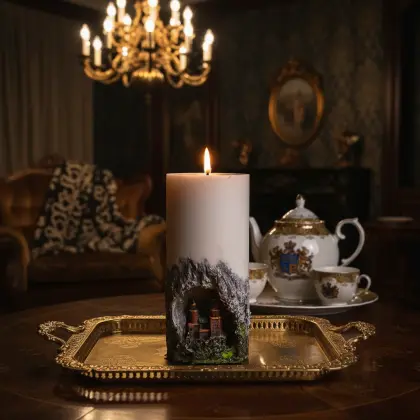 Ultra realistic cinematic photography. Use @img1; the subject hasn't changed 100%. The subject is in a dimly lit luxurious vintage living room. There is a golden chandelier on the ceiling. A richly decorated table. There is a service with the family coat of arms on the table. The subject stands on a gold Art Deco tray. A burning wick on the subject from above, the warm light of the fire softly illuminates the space. Glare on the wall. There is an armchair with a blanket in the back of the room. Studio quality 8K.